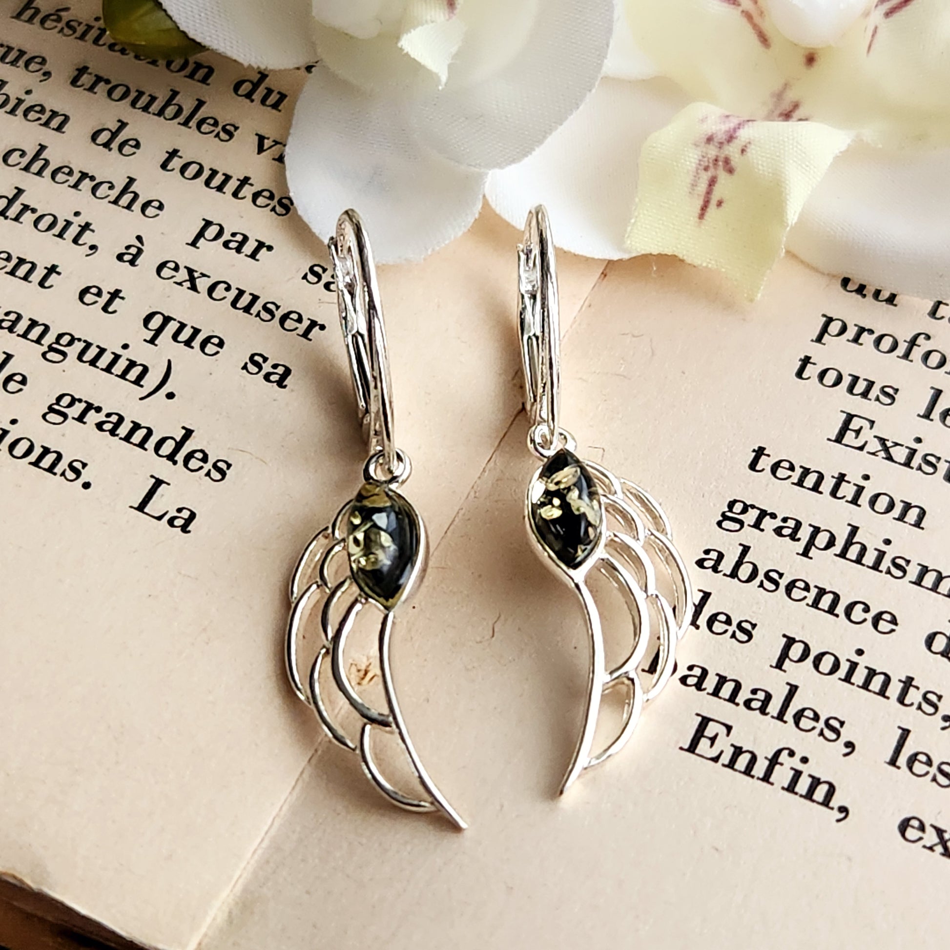 Boucles d'oreilles en Ambre vert - Ailes d'ange - Argent 925
