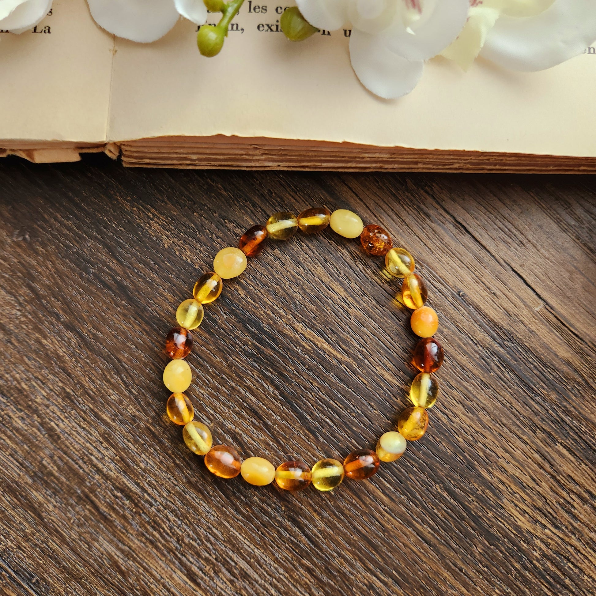 Ce bracelet en Ambre (jaune et cognac), réalisé à la main sur un fil élastique solide et résistant, est conçu pour un adulte avec un tour de poignet compris entre 17 et 20 cm, alliant élégance, confort et bienfaits naturels.