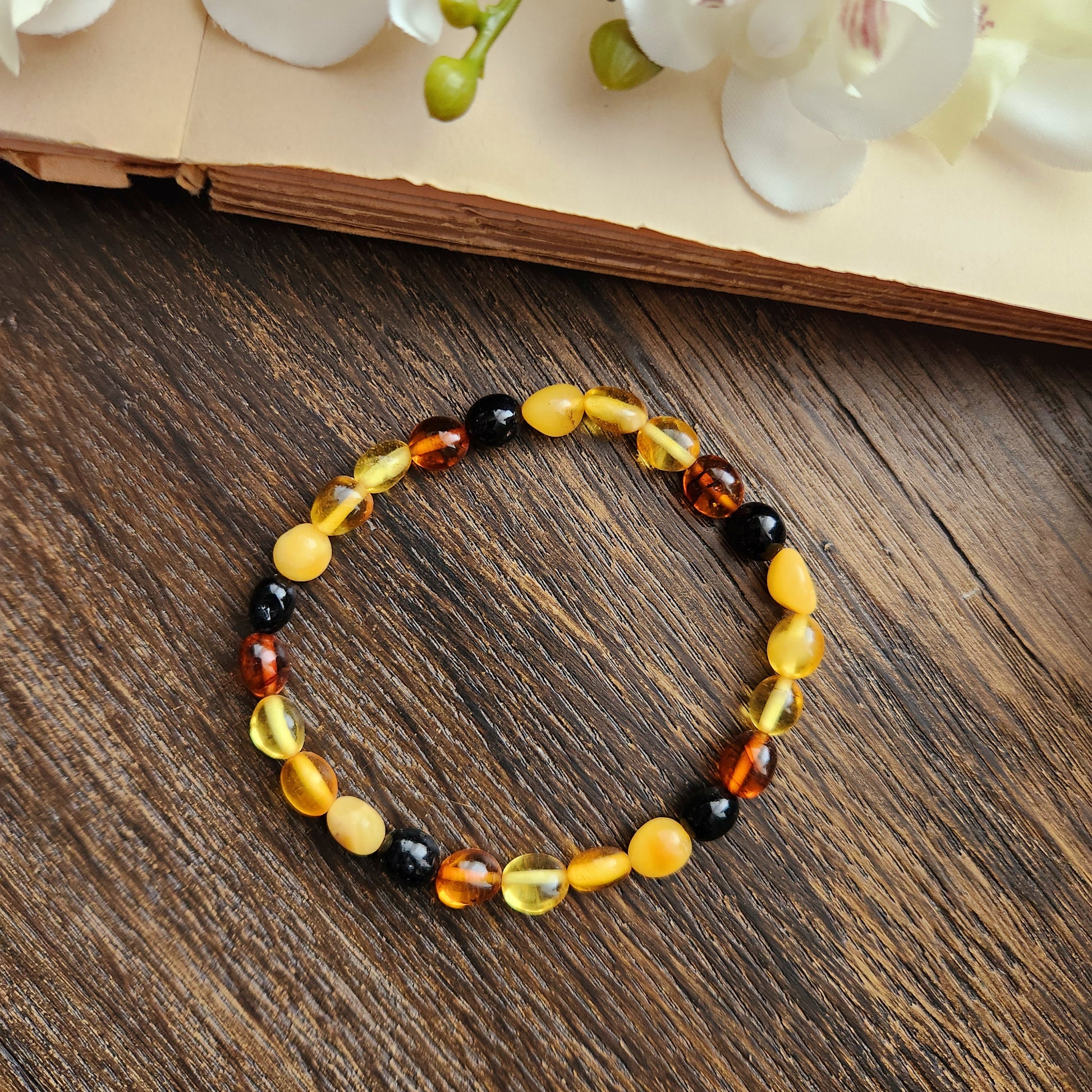 Ce bracelet aux 3 couleurs d'Ambre, réalisé à la main sur un fil élastique solide et résistant, est conçu pour un adulte avec un tour de poignet compris entre 17 et 20 cm, alliant élégance, confort et bienfaits naturels.