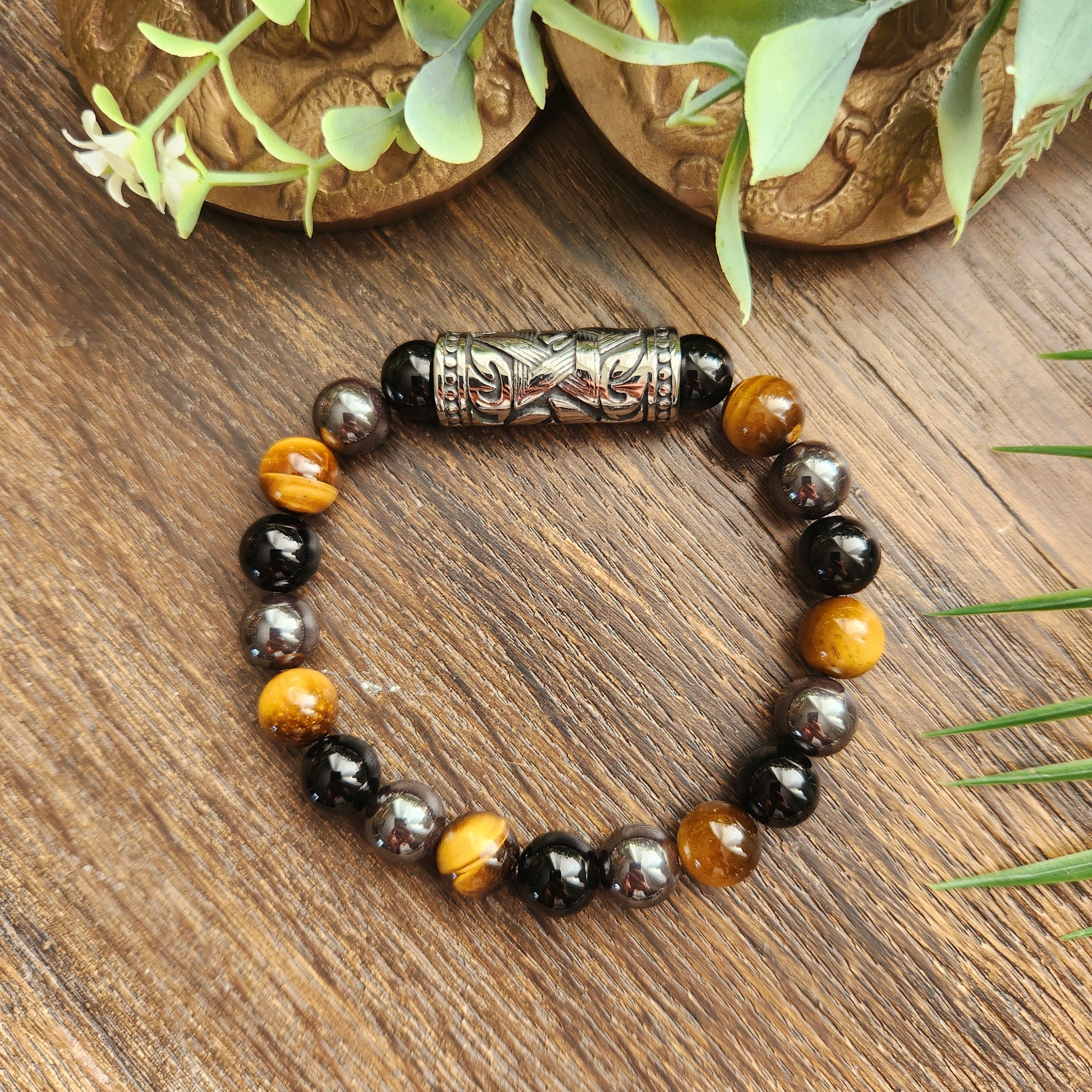 • Le bracelet Triple protection est composé de 3 pierres différentes, l'Œil de Tigre, l'Obsidienne noire et l'Hématite. Il est entièrement fabriqué à la main dans notre atelier.