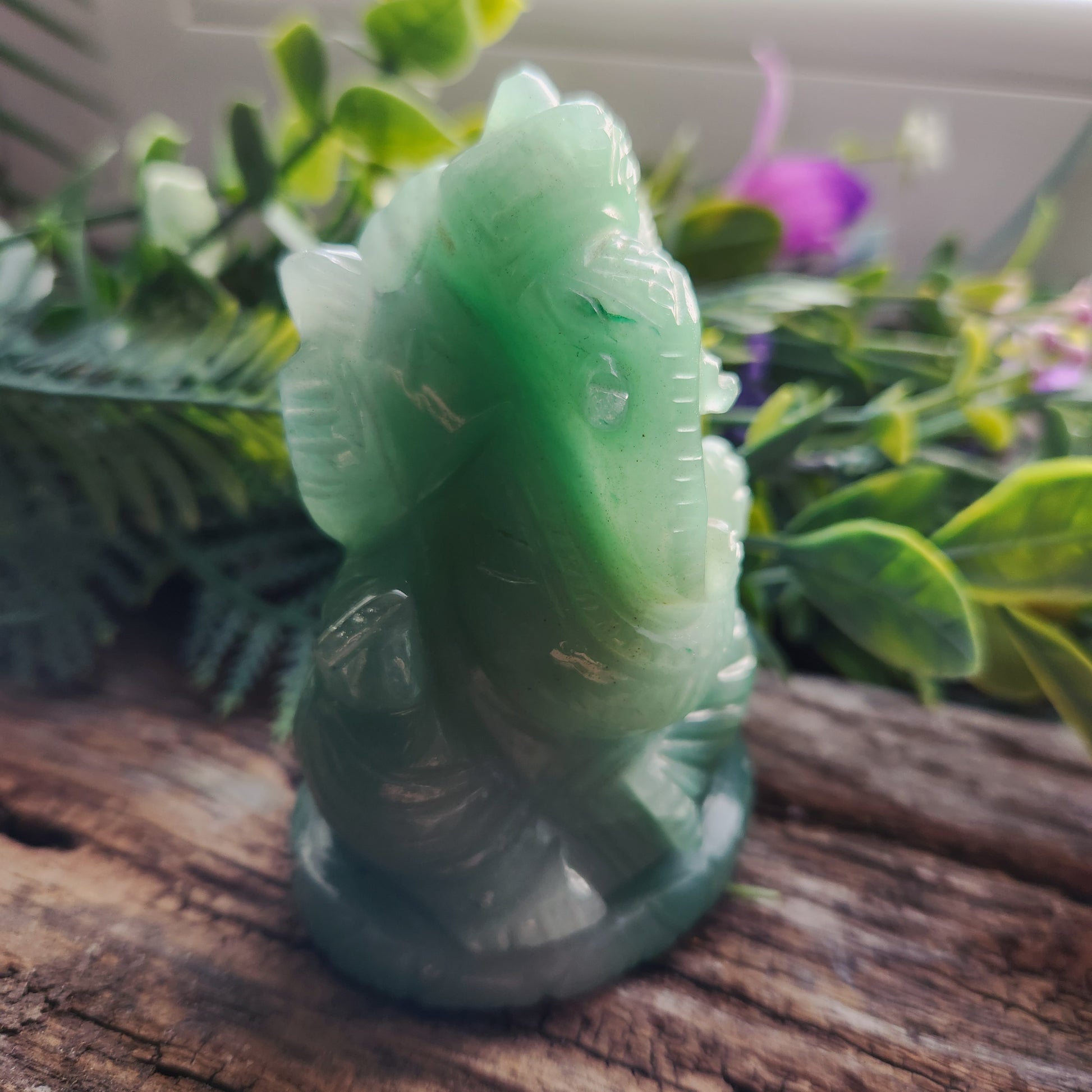 - Cette pièce artisanale représente Ganesh, le dieu hindou à tête d’éléphant, symbole de sagesse, de prospérité et de succès. Chaque détail de la sculpture en aventurine verte est finement travaillé pour refléter la bienveillance et la force de cette divinité, tandis que la pierre diffuse harmonie, apaisement et énergie positive.