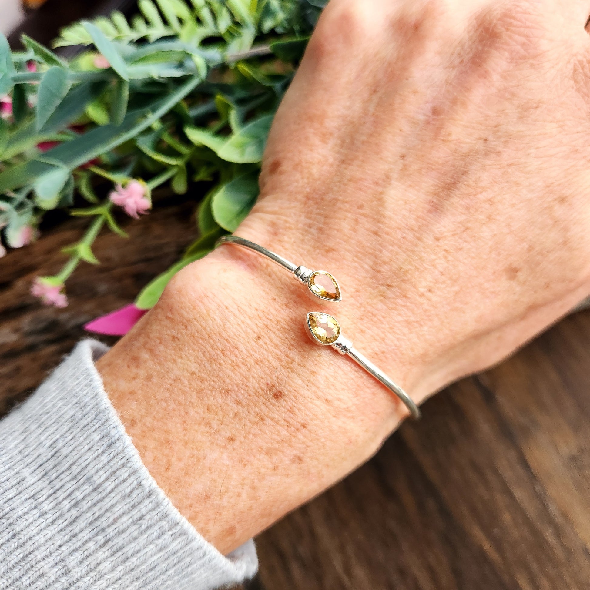 Ce jonc en Argent 925, fin, chic et élégant, orné de deux pierres naturelles et ultra léger à porter, s’adapte parfaitement aux poignets de 16 à 21 cm pour un style raffiné et confortable.