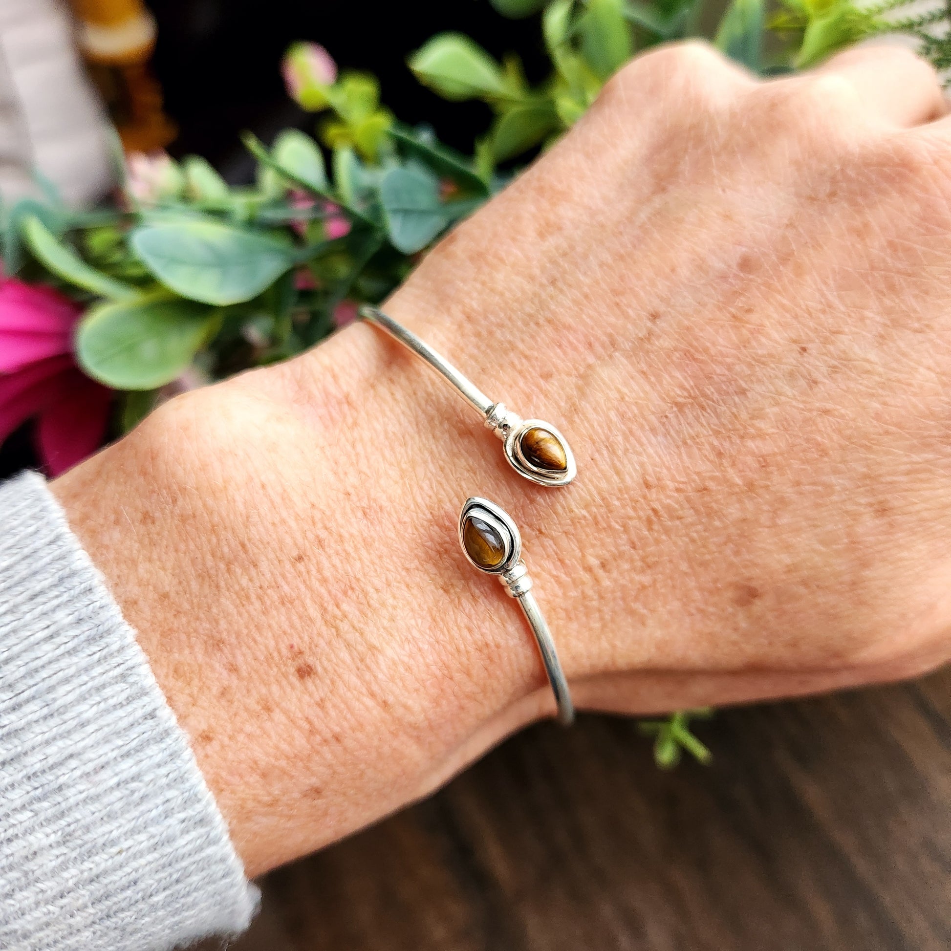 Ce jonc en Argent 925, fin, chic et élégant, orné de deux pierres naturelles et ultra léger à porter, s’adapte parfaitement aux poignets de 16 à 21 cm pour un style raffiné et confortable.