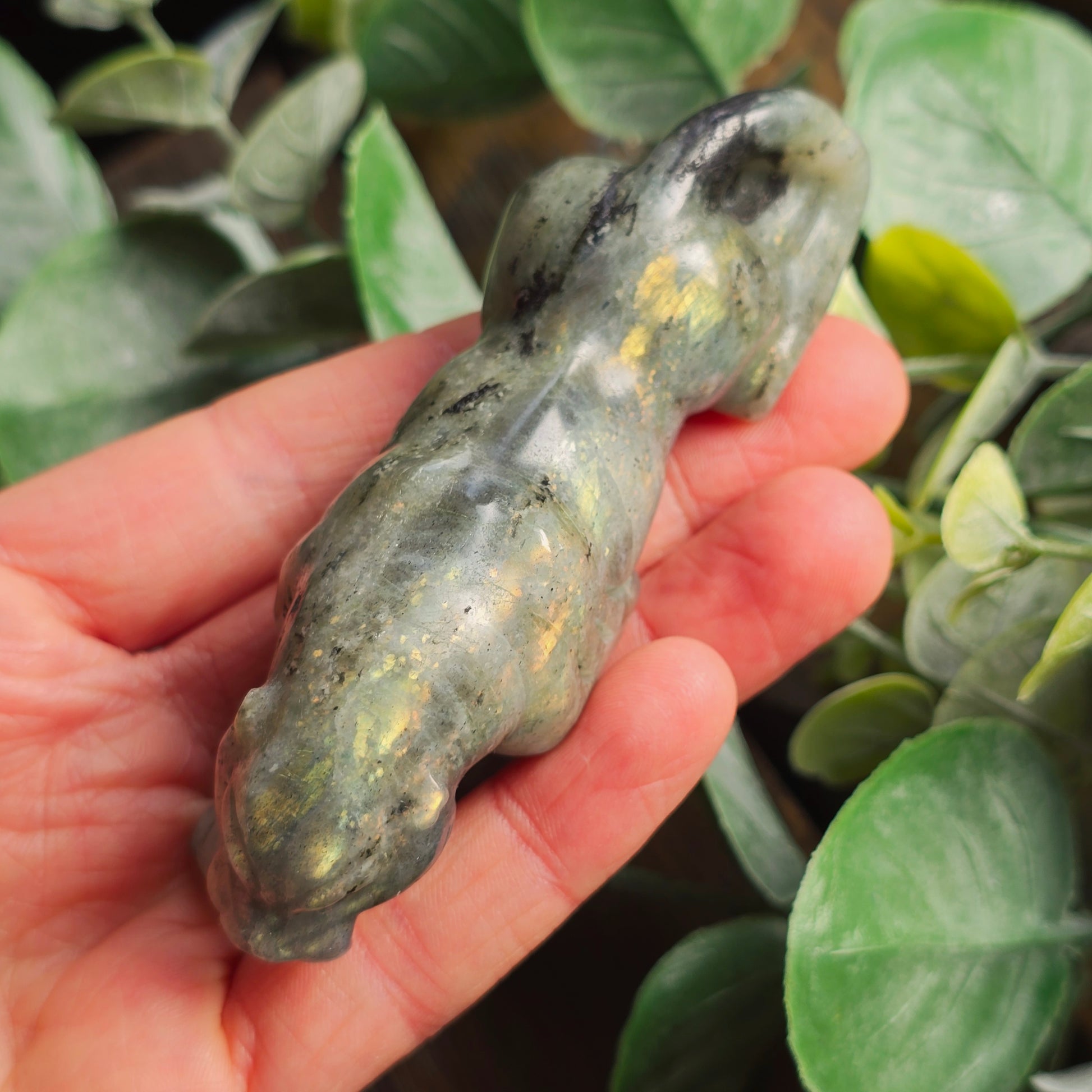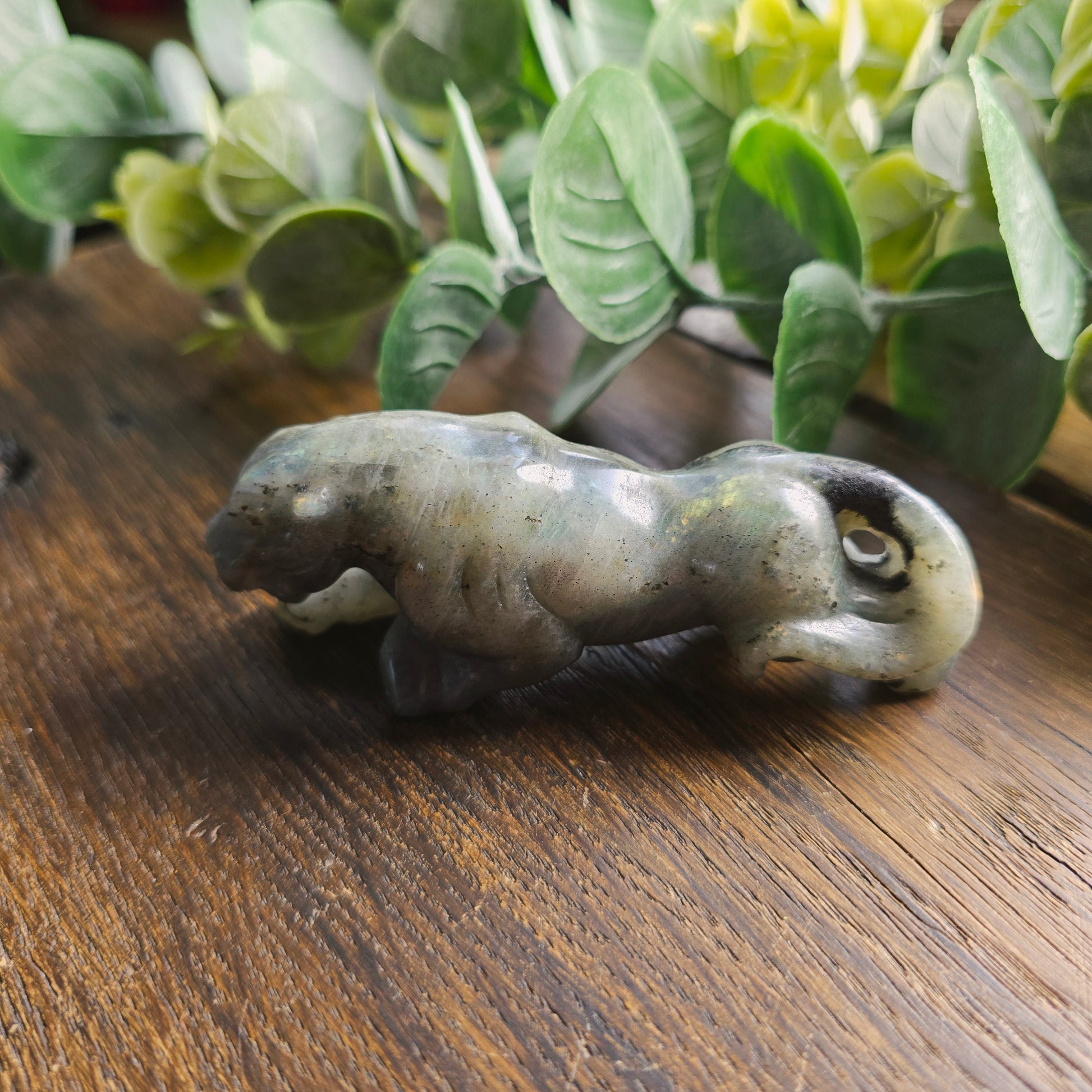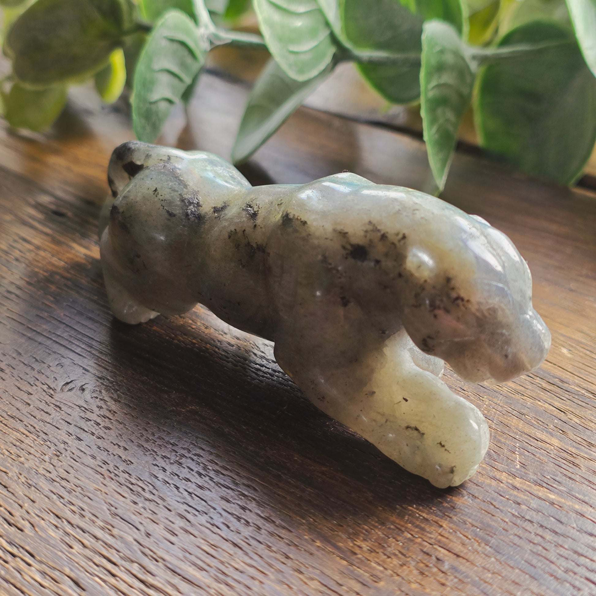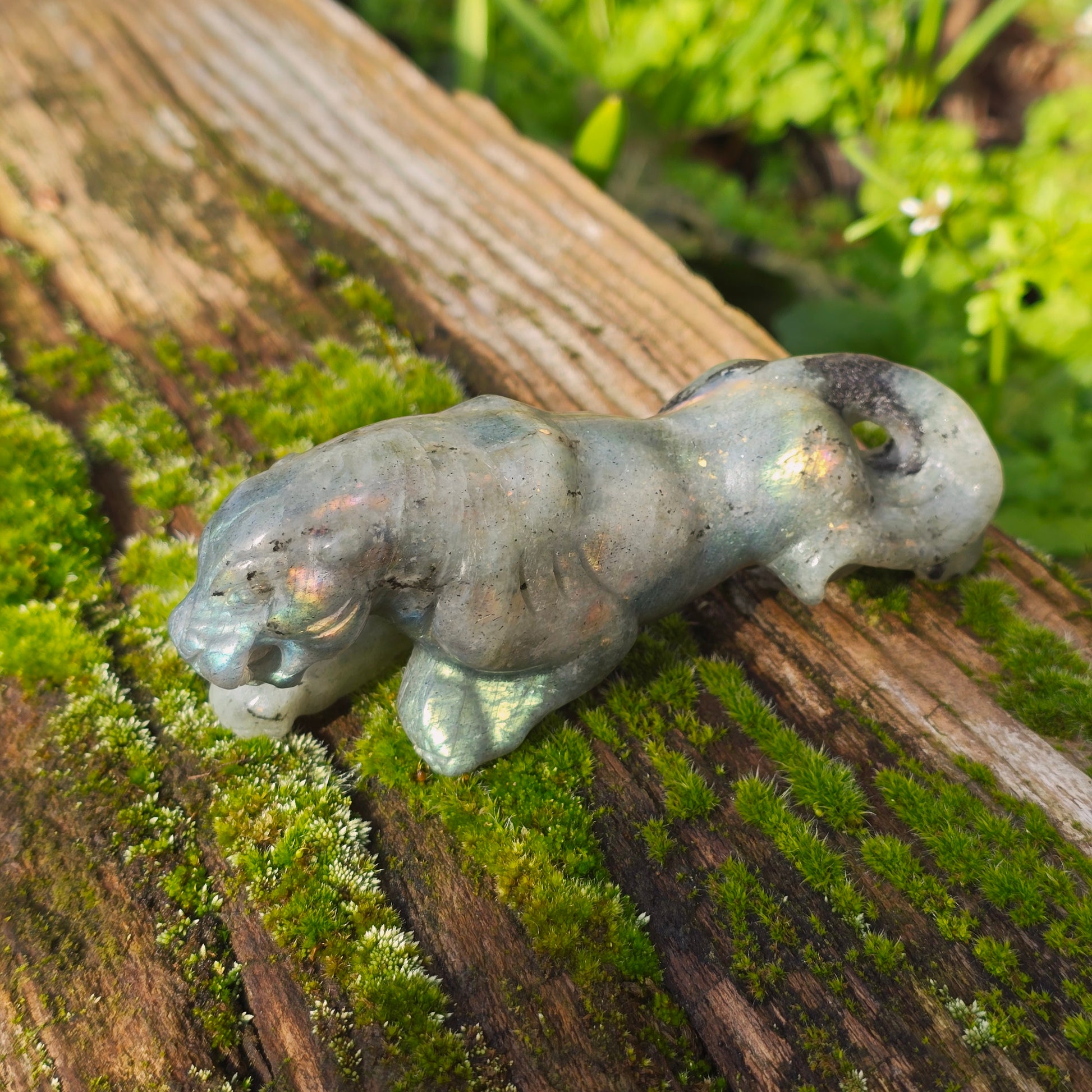Un léopard en labradorite incarne la force intuitive et la protection, alliant la puissance féline à l’énergie mystique et lumineuse de cette pierre aux reflets changeants.