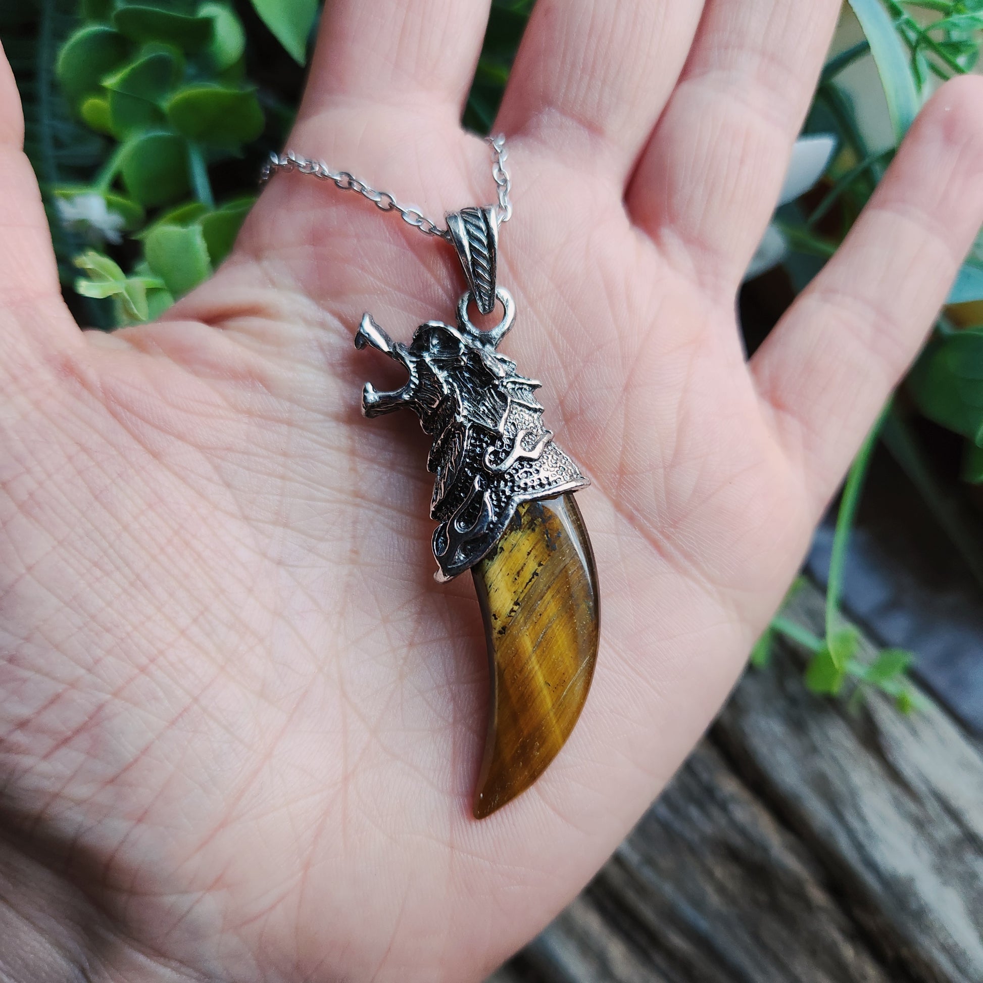 Découvrez ce pendentif tête de loup, symbole de force et d’instinct, sublimé par une pierre naturelle taillée en forme de dent, pour un bijou au caractère puissant et protecteur. Chaque pierre est soigneusement sélectionnée pour ses nuances uniques, puis montée sur une structure robuste en acier inoxydable, garantissant durabilité et confort au quotidien. Un pendentif affirmé, idéal pour celles et ceux qui souhaitent porter un symbole de courage, de liberté et de connexion à la nature.