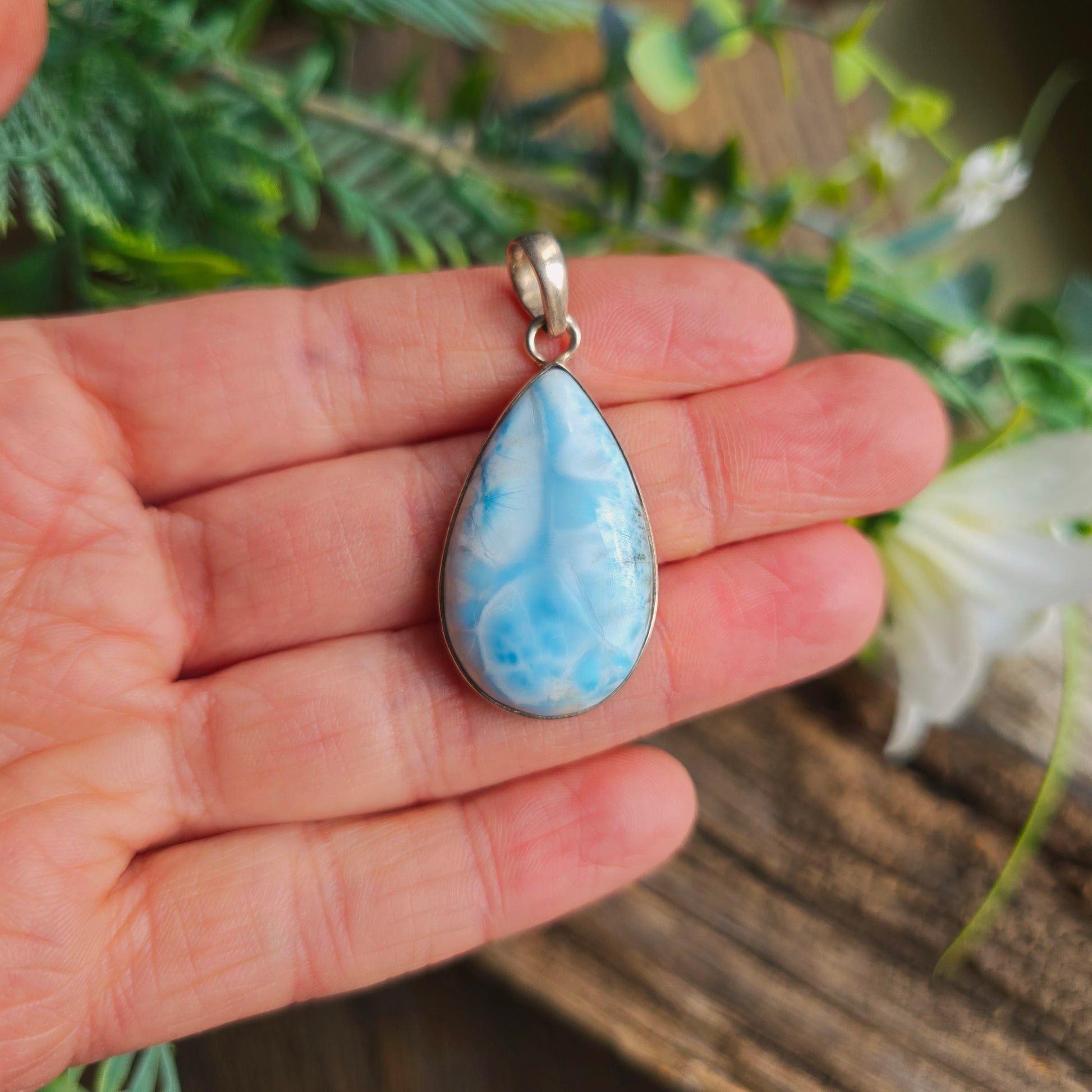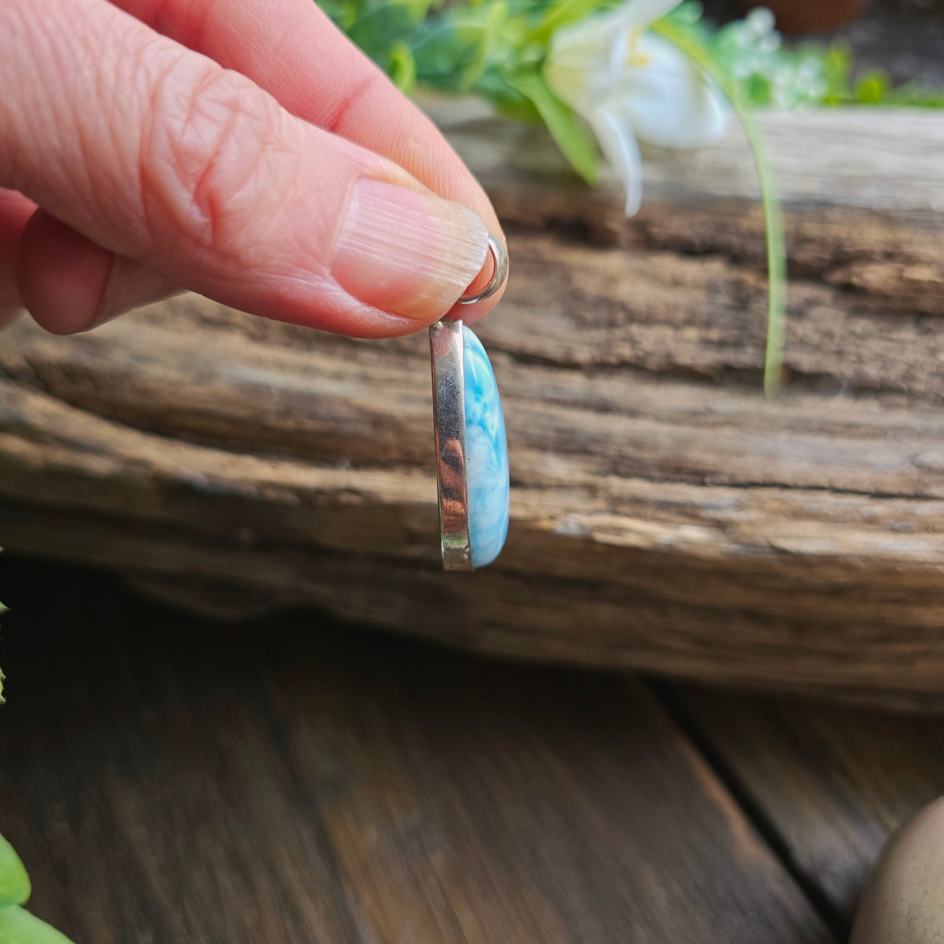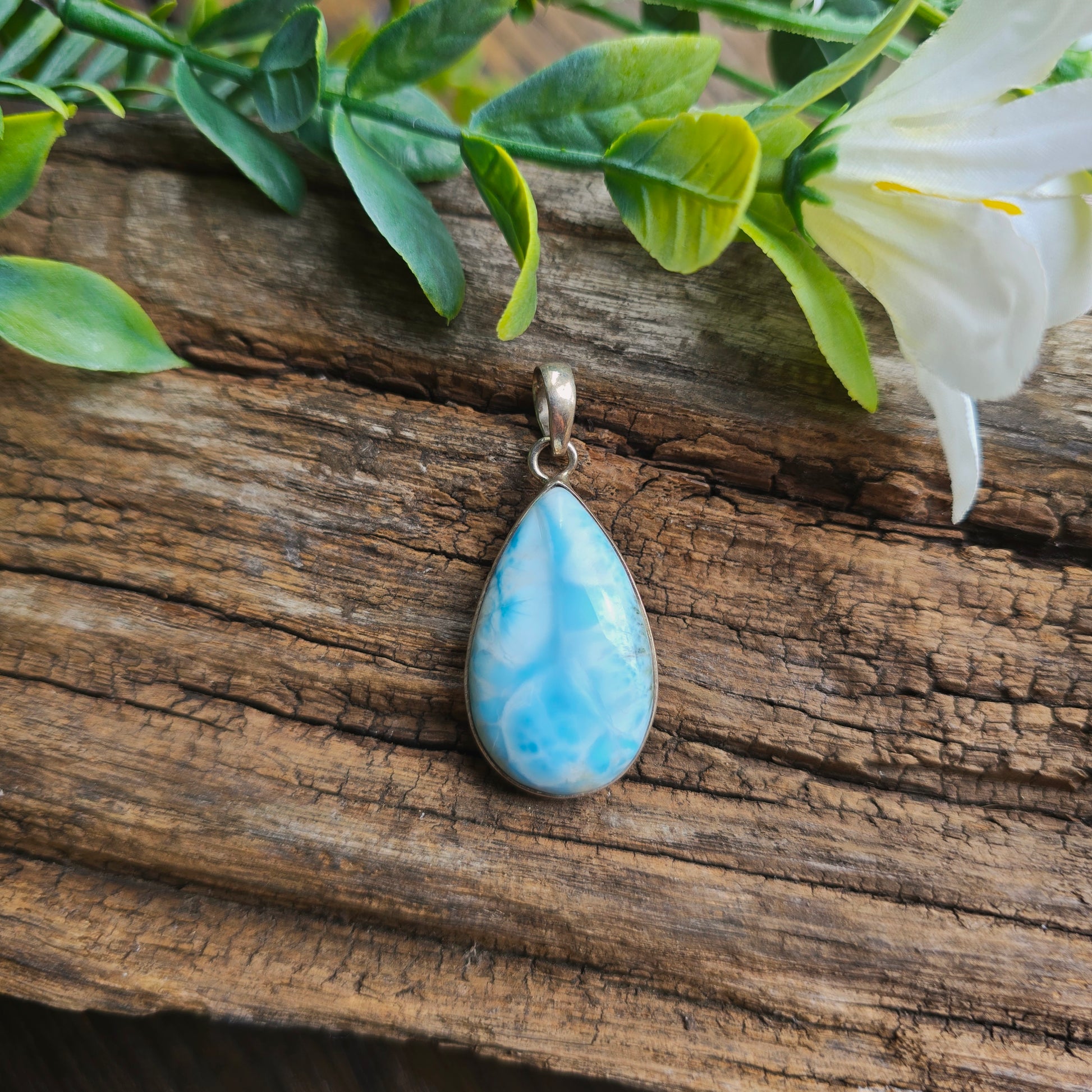 Découvrez l’élégance pure de notre pendentif en Larimar AAA, une pierre rare et précieuse reconnue pour sa qualité exceptionnelle. Venue directement de la République dominicaine, cette pierre se distingue par ses nuances douces de bleu et ses reflets naturels uniques, évoquant la sérénité des eaux tropicales.