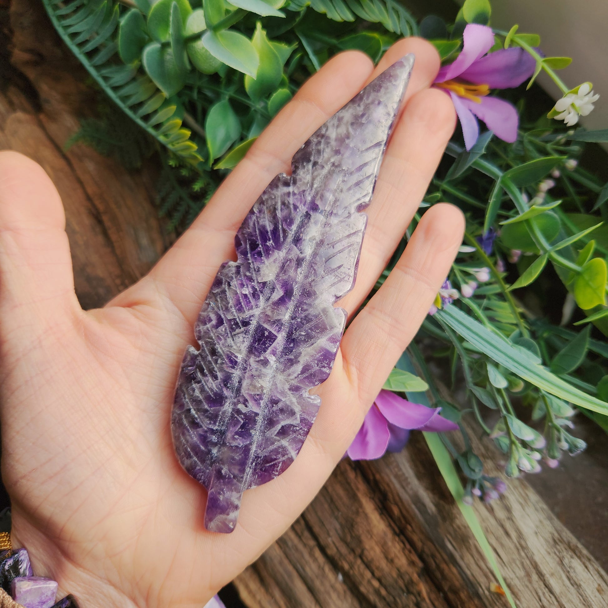 Une plume sculptée en améthyste est un symbole puissant de légèreté, de liberté et de connexion spirituelle. Chaque détail de la sculpture met en valeur la pierre naturelle, qui apporte ses vertus d’apaisement, de clarté mentale et de protection énergétique.