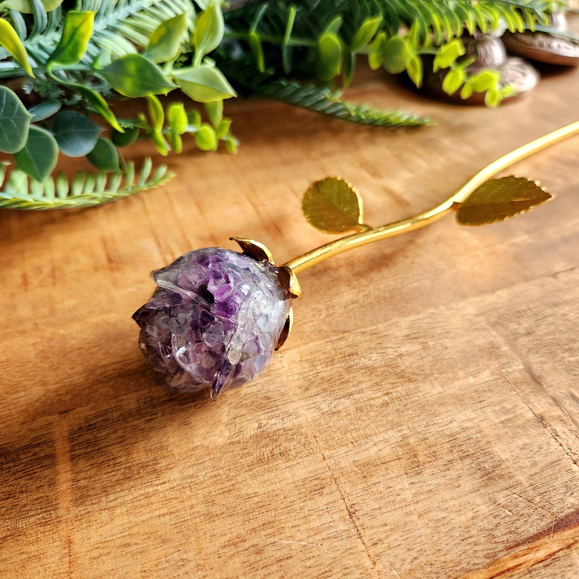 Sa tige en métal dorée, fine et raffinée, souligne la beauté brute de la pierre tout en offrant une tenue parfaite. Elle peut être exposée debout dans un vase, posée ou insérée dans un bouquet éternel.