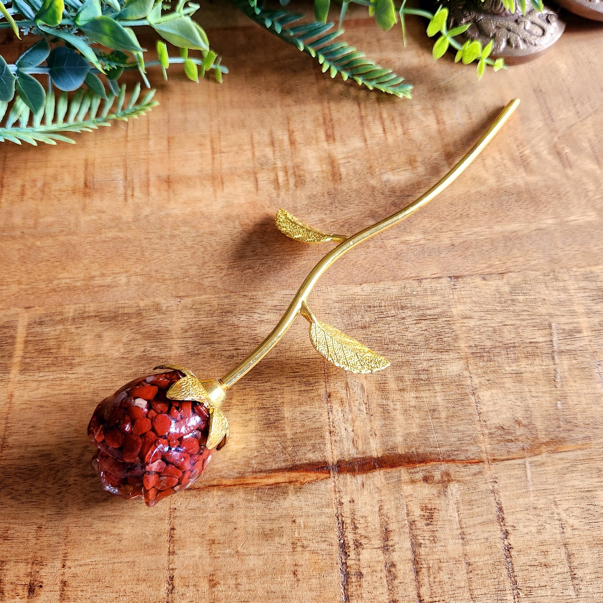 Sa tige en métal dorée, fine et raffinée, souligne la beauté brute de la pierre tout en offrant une tenue parfaite. Elle peut être exposée debout dans un vase, posée ou insérée dans un bouquet éternel.
