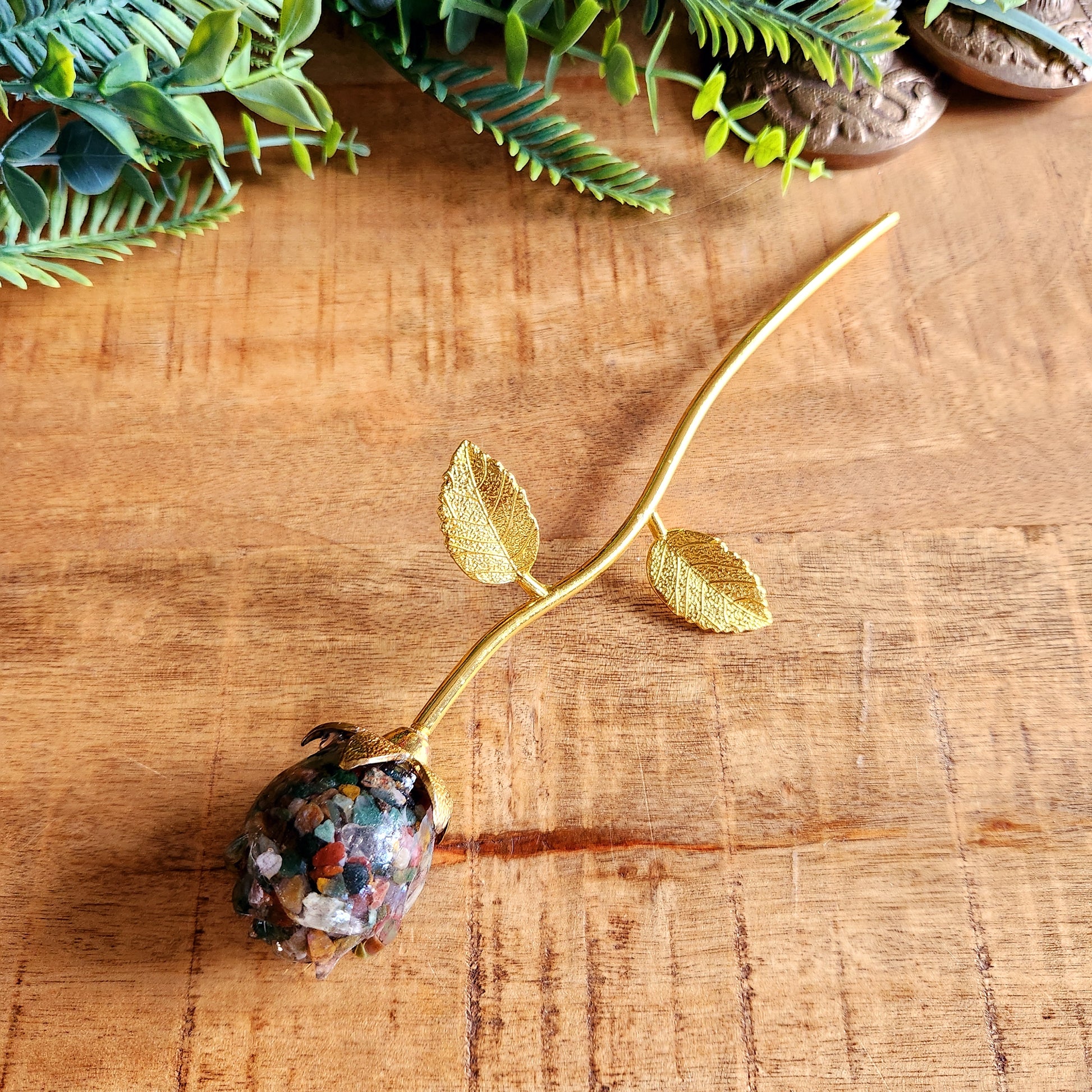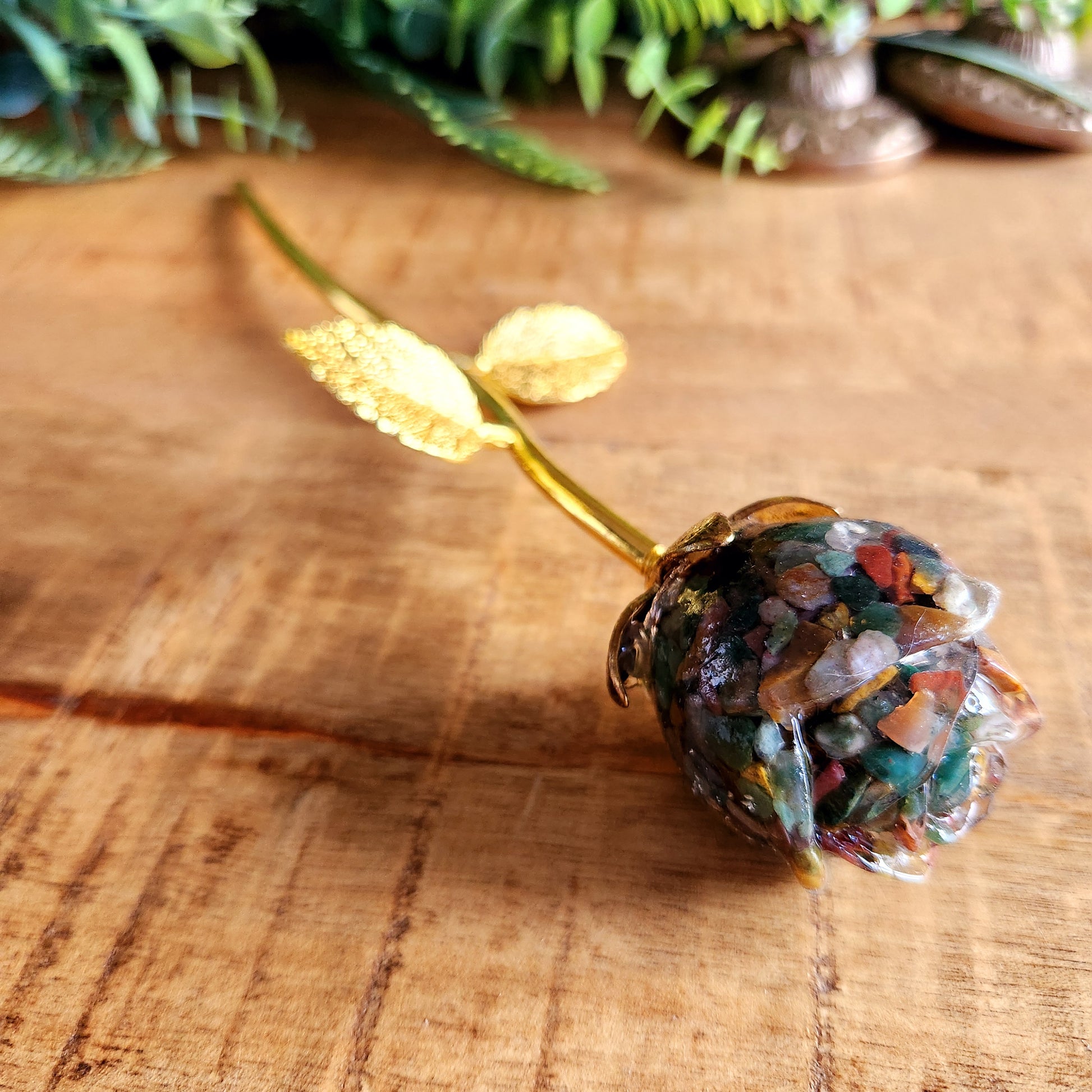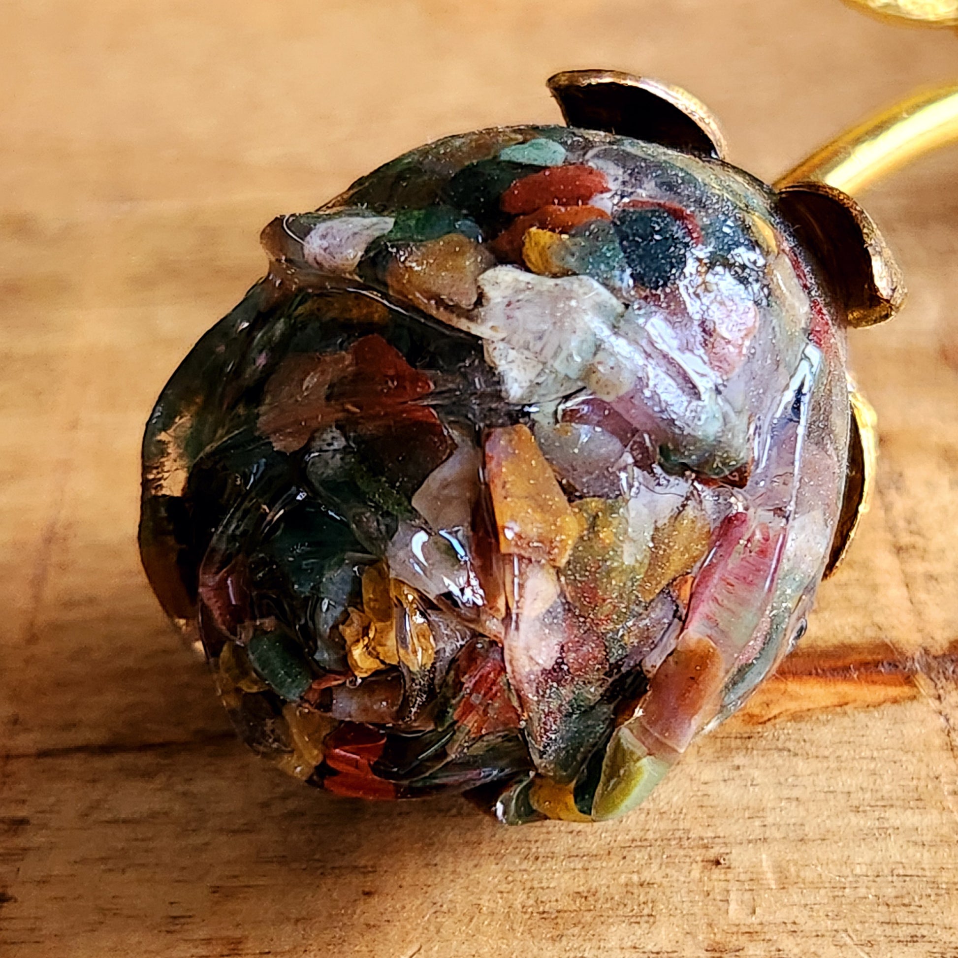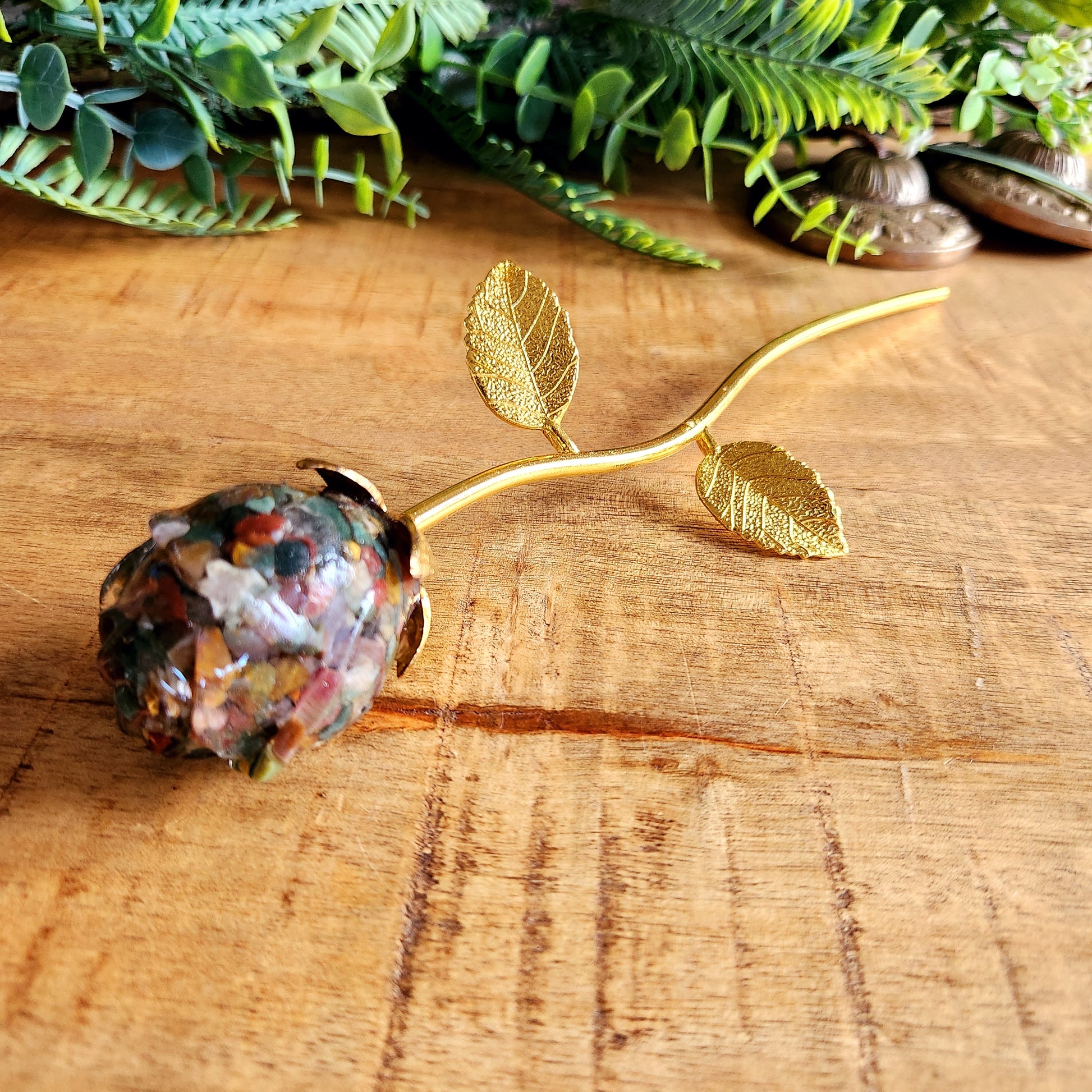 Une rose composée de plusieurs pierres différentes coulées dans de la résine combine et harmonise les énergies de chaque minéral, offrant un équilibre global entre protection, apaisement, vitalité et élévation spirituelle.