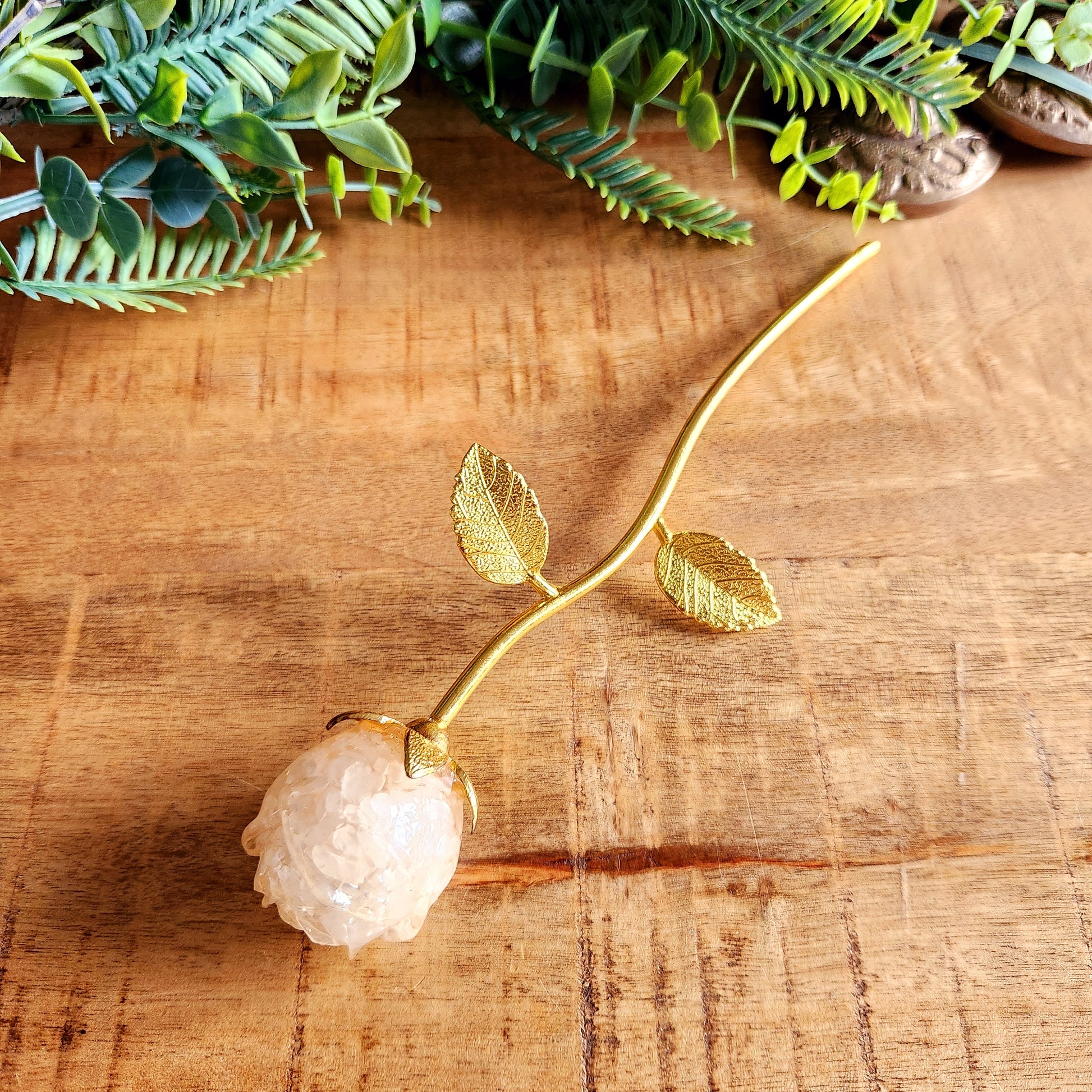 Rose en Quartz blanc - tige dorée