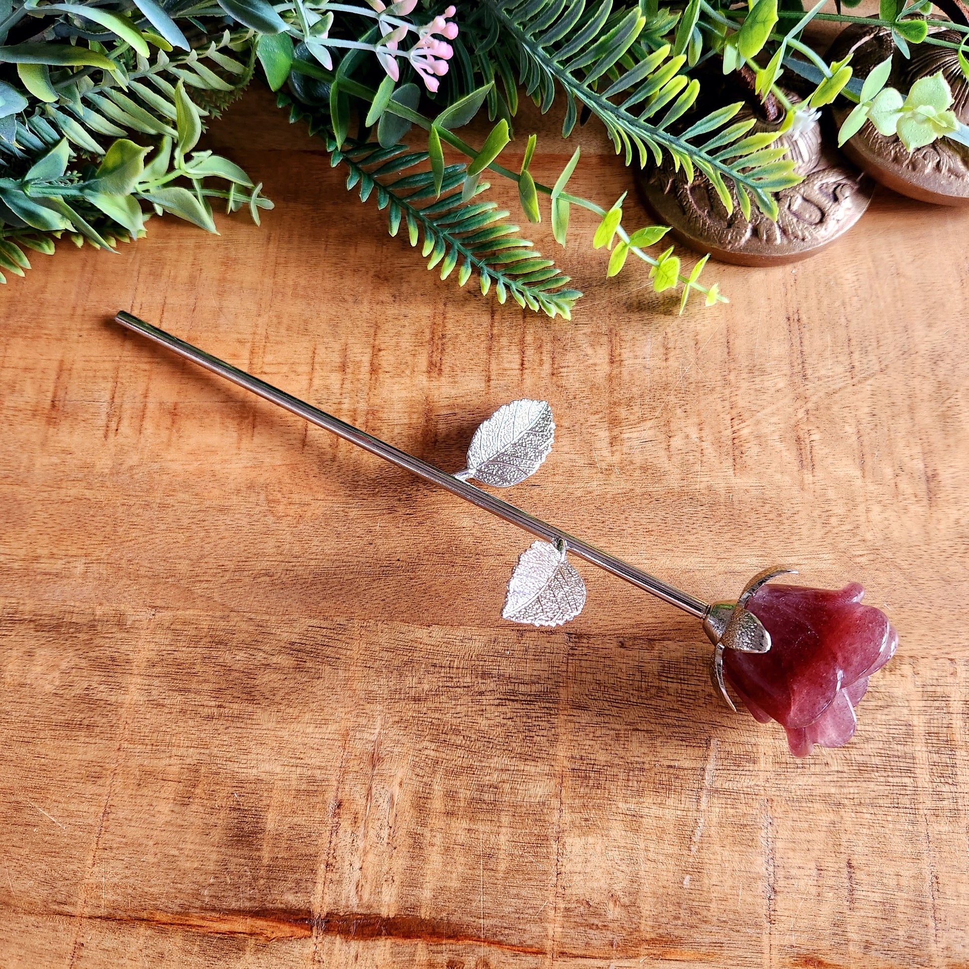 Sa tige en métal argenté, fine et raffinée, souligne la beauté brute de la pierre tout en offrant une tenue parfaite. Elle peut être exposée debout dans un vase, posée ou insérée dans un bouquet éternel.