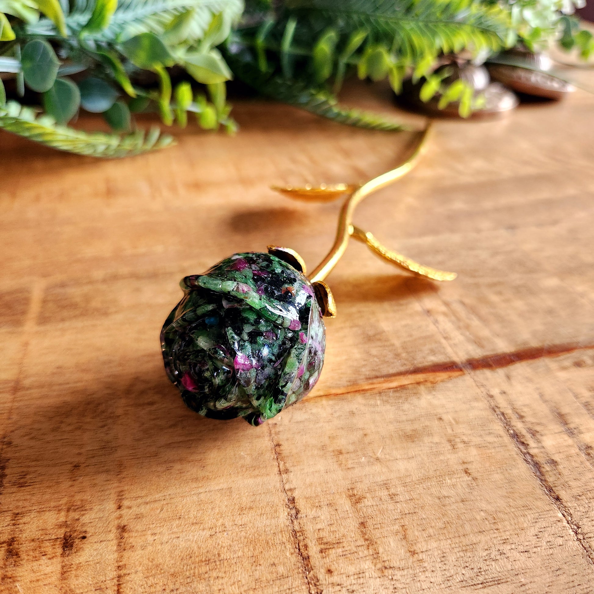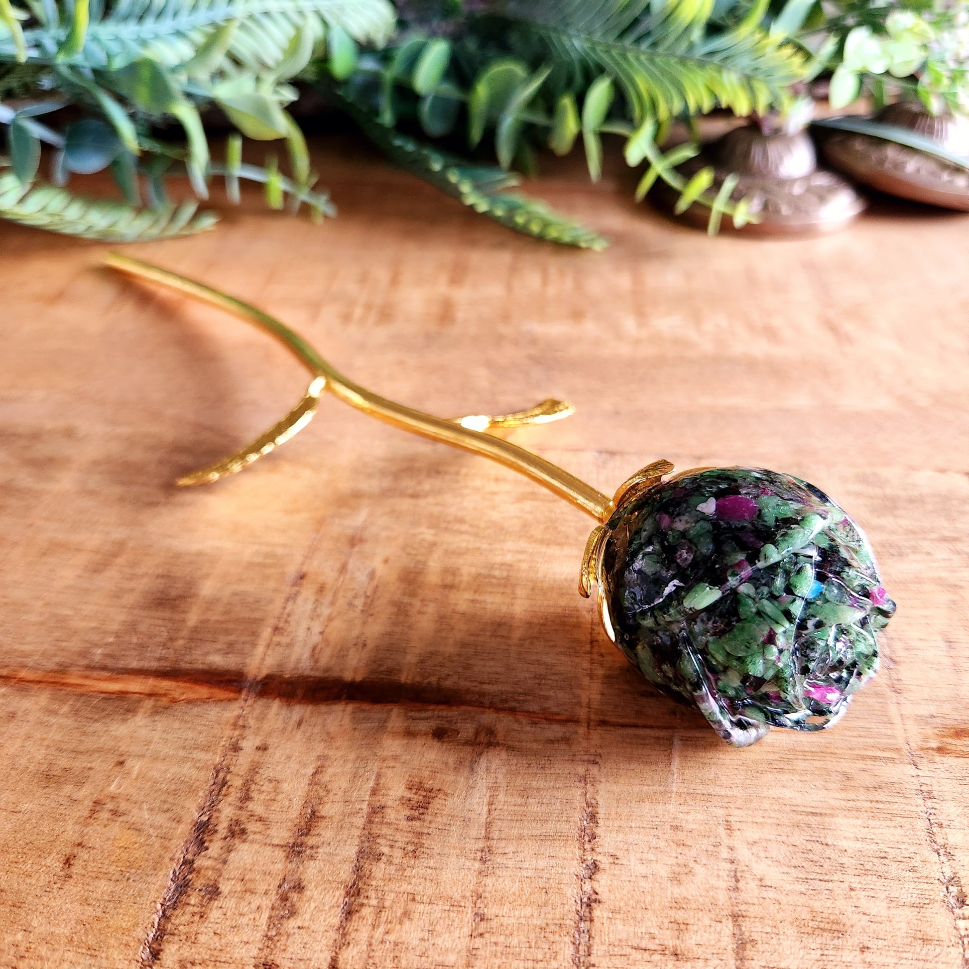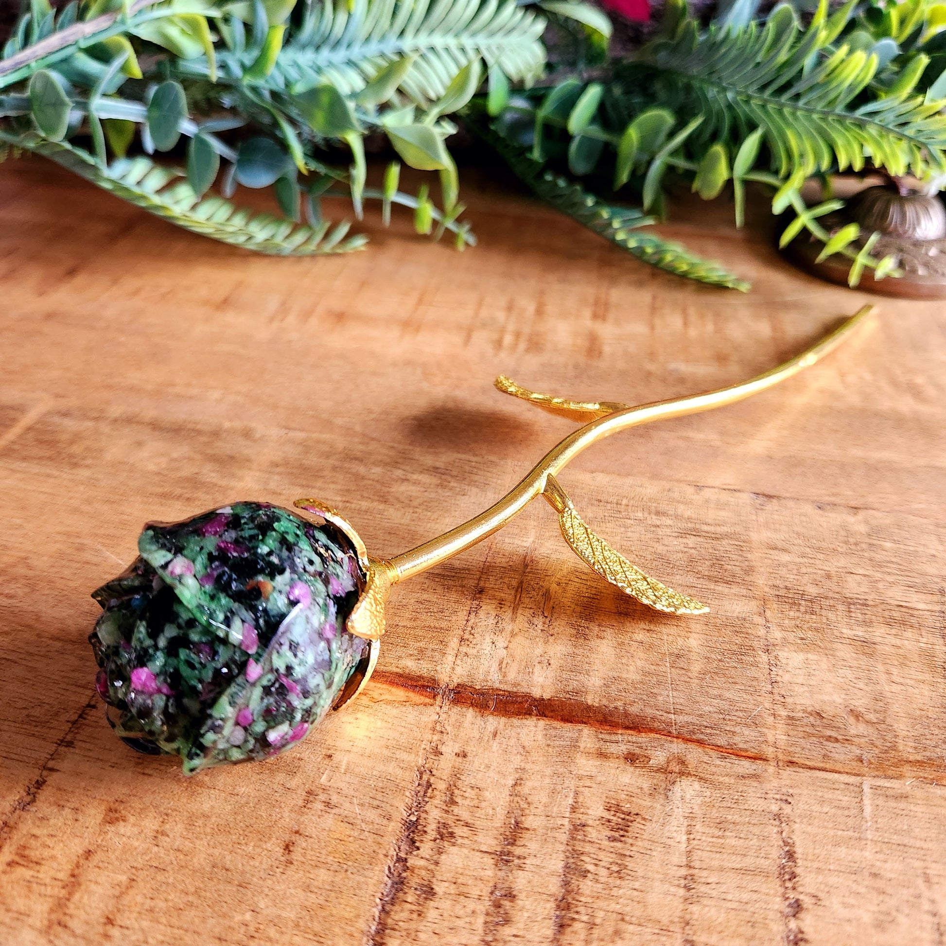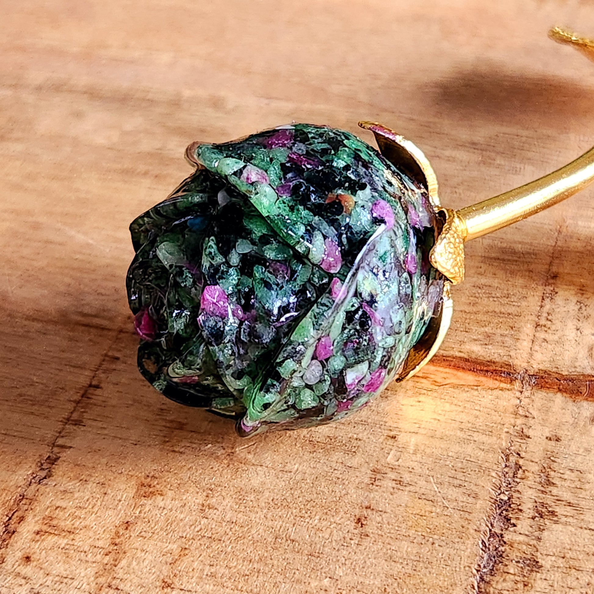 Rose en Rubis zoïsite - tige dorée