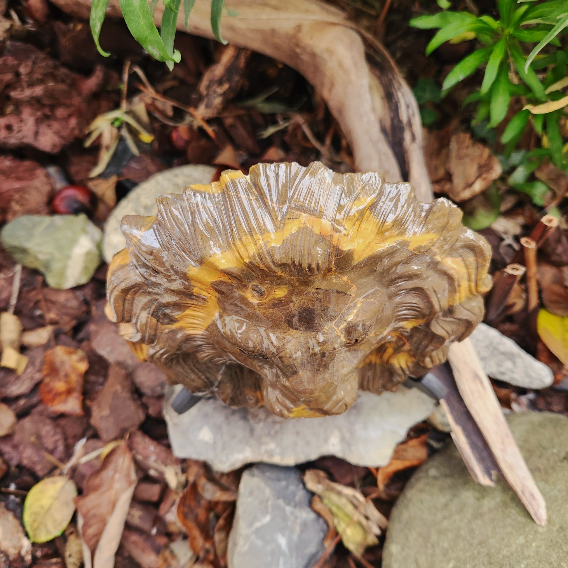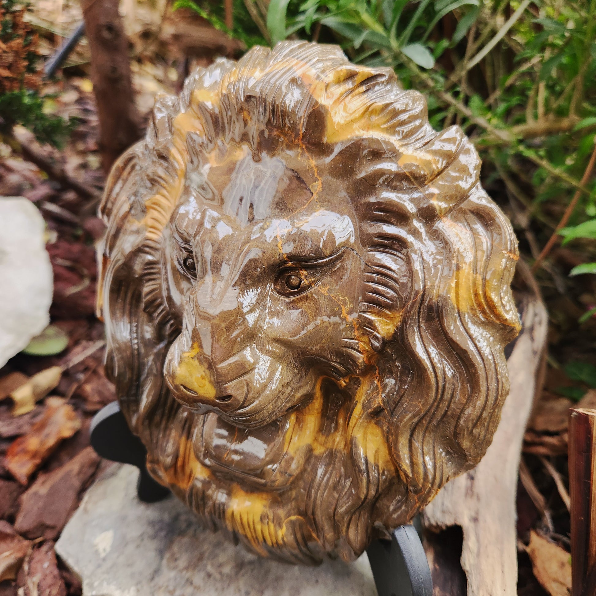 Le lion représente courage, protection et autorité, tandis que le jaspe chocolat favorise l’ancrage, la confiance en soi et l’équilibre émotionnel, faisant de cette sculpture un talisman de force et de sérénité.