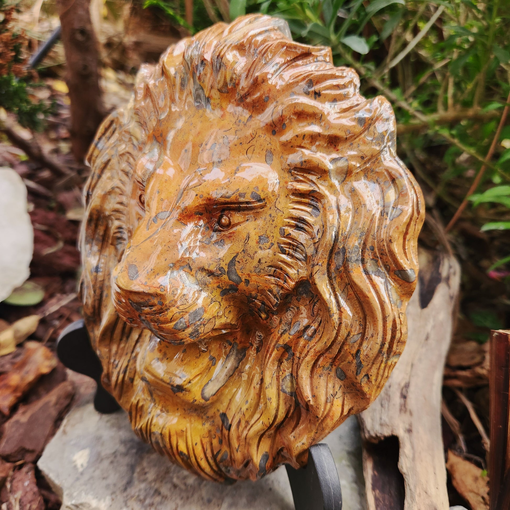 Le lion symbolise courage, protection et autorité, tandis que le jaspe océan favorise sérénité, ancrage et harmonie intérieure, faisant de cette sculpture un talisman de force et de confiance.