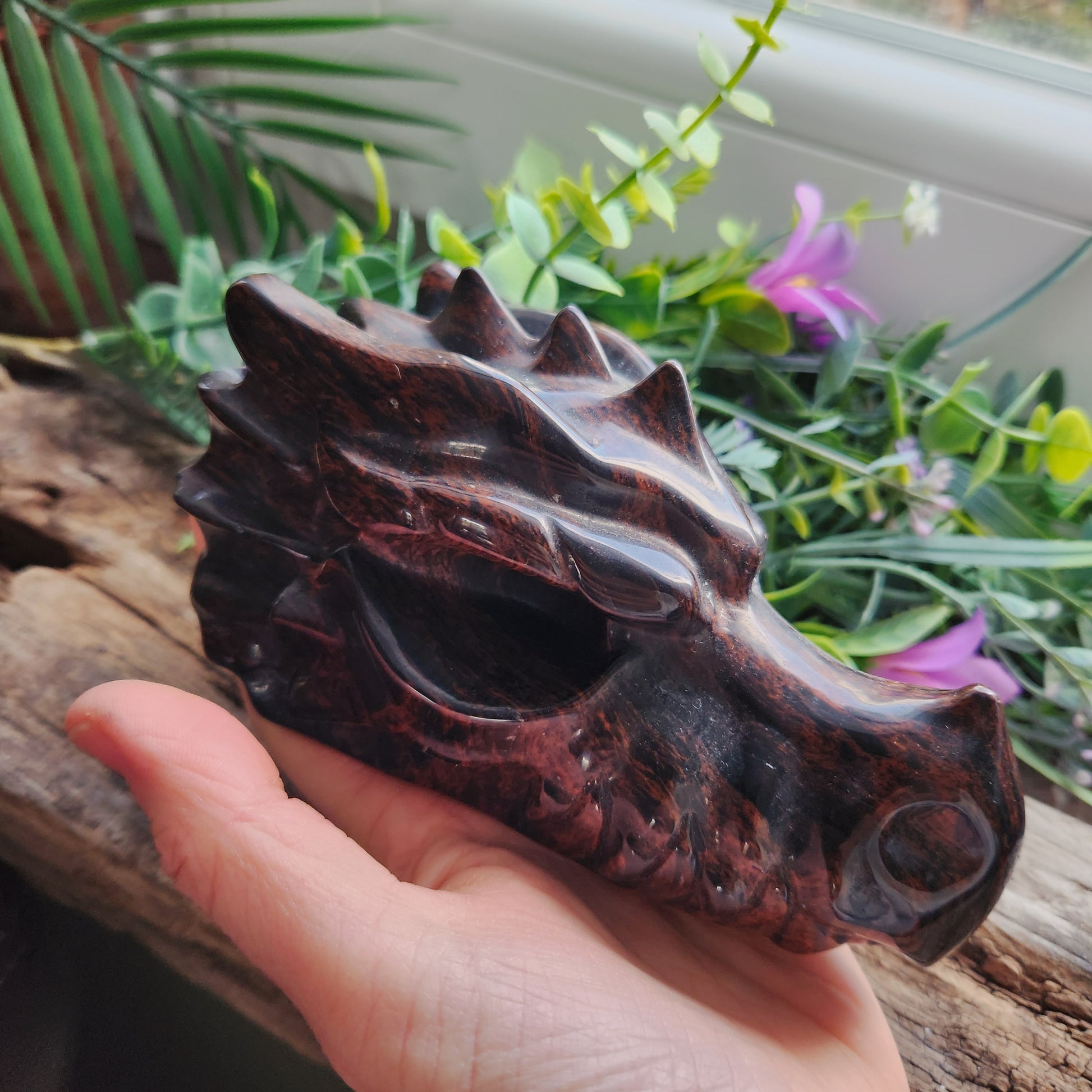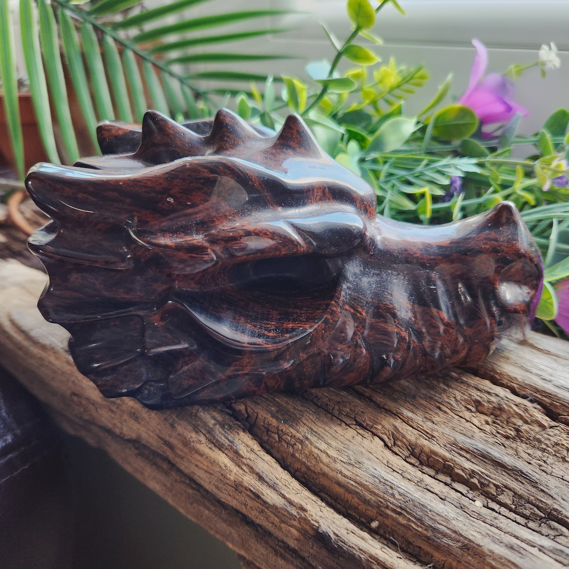 Le dragon symbolise courage, protection et sagesse, tandis que l’obsidienne acajou favorise ancrage, force intérieure et équilibre émotionnel, faisant de cette sculpture un talisman de puissance et de sécurité.